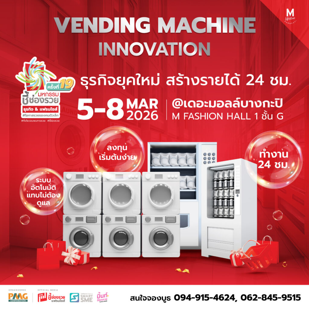 มหกรรมชี้ช่องรวย Vending Machine ครั้งที่ 19 คือ งานแสดงธุรกิจและแฟรนไชส์ตู้หยอดเหรียญที่รวมโอกาสการลงทุนไว้ครบในที่เดียว เหมาะสำหรับผู้ที่กำลังมองหา ธุรกิจทำเงิน 24 ชั่วโมง ไม่ต้องเฝ้าร้าน และสามารถต่อยอดสร้างรายได้ระยะยาวได้จริง ในยุคที่ต้นทุนเวลาและแรงงานสูงขึ้น ธุรกิจ Vending Machine ได้กลายเป็นหนึ่งในโมเดลธุรกิจมาแรง เพราะสามารถทำงานแทนเจ้าของได้ตลอดทั้งวัน รองรับทั้งผู้เริ่มต้นธุรกิจใหม่ ผู้มองหารายได้เสริม ไปจนถึงผู้ที่ต้องการขยายพอร์ตการลงทุนอย่างมั่นคง
