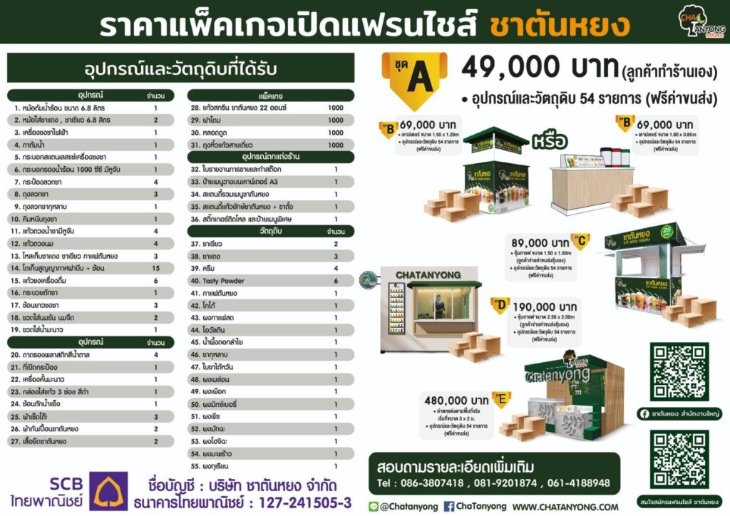 ชาตันหยง แฟรนไชส์เครื่องดื่ม ที่เป็นที่นิยมอยู่เสมอแม้ว่าจะมีแบรนด์เครื่องดื่มเพิ่มมากขึ้นก็ตาม ด้วยจุดเด่นความอร่อยที่เป็นเอกลักษณ์ ชาใต้แท้ ๆ กลิ่นหอม รสชาติกลมกล่อม จึงมัดใจลูกค้าได้อย่างไม่ยาก การันตีความสำเร็จมากกว่า 1,600 สาขาทั่วประเทศ จุดเด่นอยู่ที่วัตถุดิบที่นำมาใช้ในแต่ละแก้ว เป็นวัตถุดิบที่ดีจากแหล่งวัตถุดิบคุณภาพ มีเมนูหลากหลายทั้งร้อนเย็น ครอบคลุมความต้องการ มีบัตรสะสมแต้ม ซื้อครบกำหนดแถมฟรี 1 แก้ว